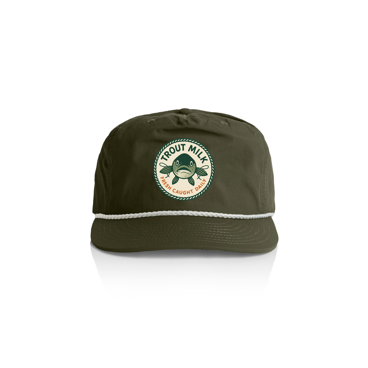 Single panel at front, plastic snapback, tonal under-peak lining, mesh structure support Contrast matt nylon rope at front of crown