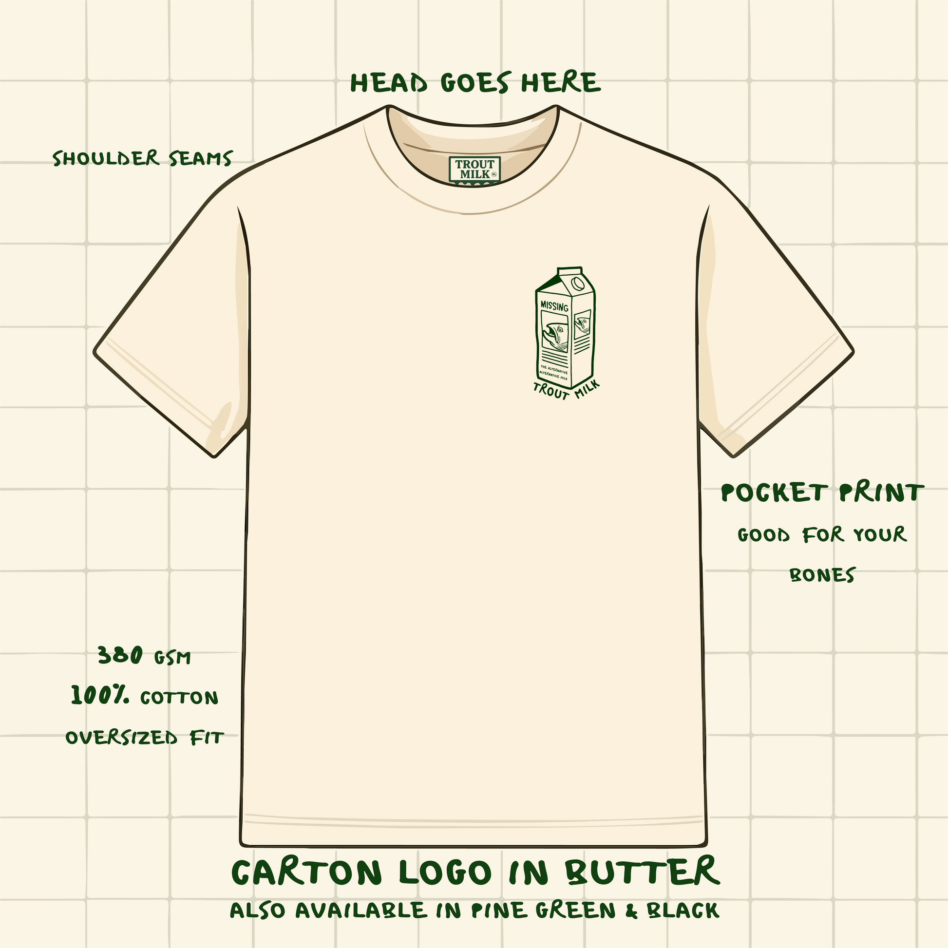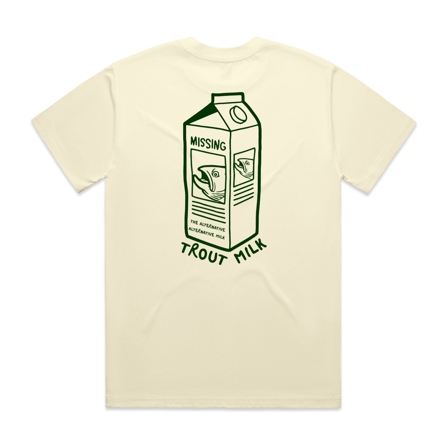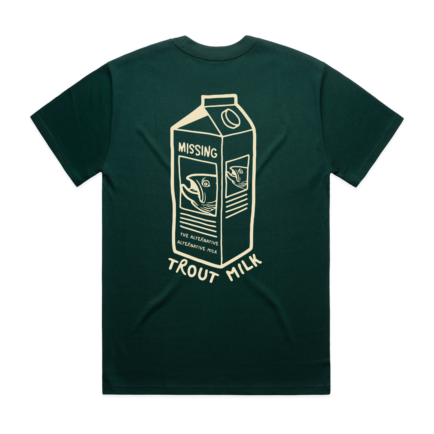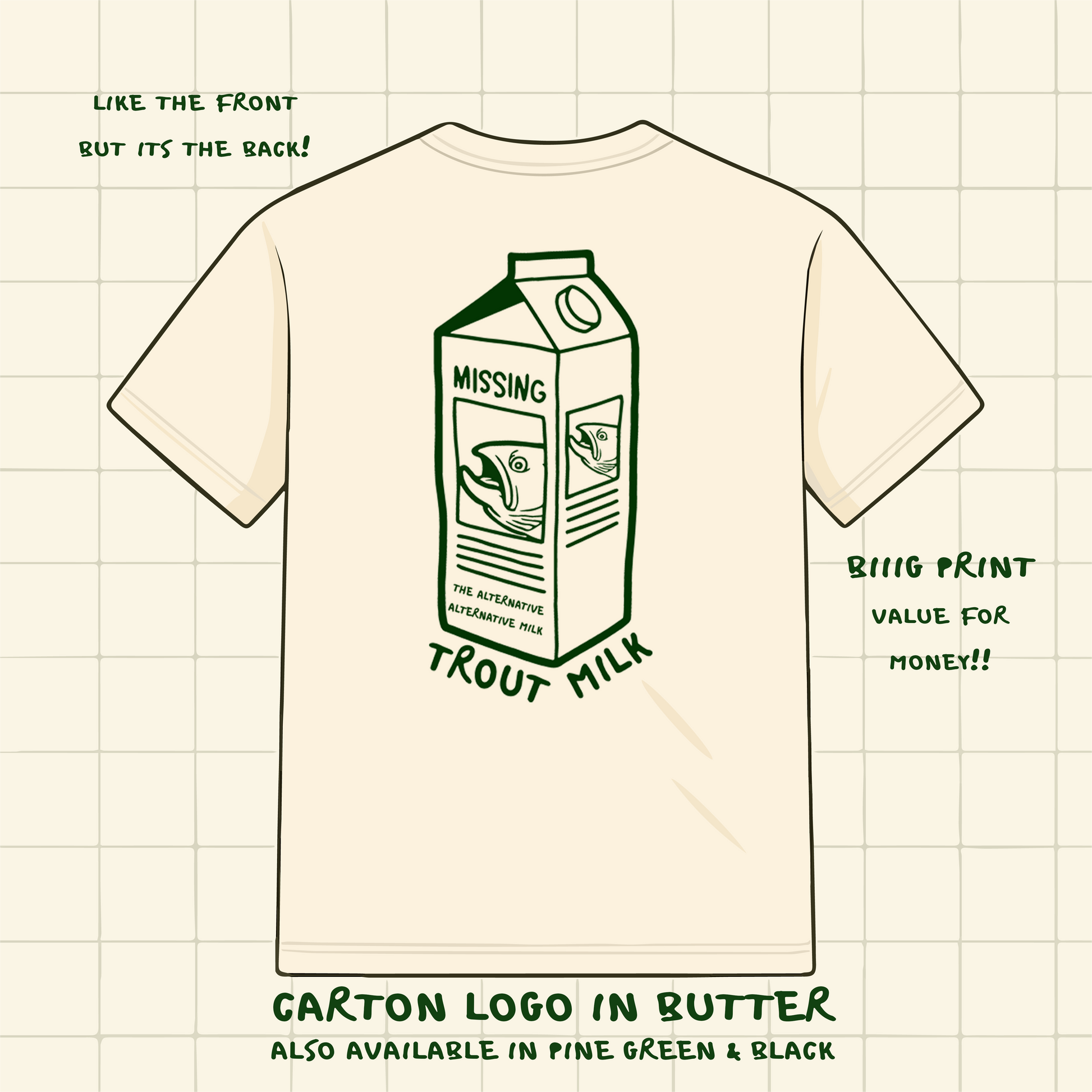 The front features the Trout Milk Carton logo — a quietly absurd icon for those in the know. Field-tested, street-approved